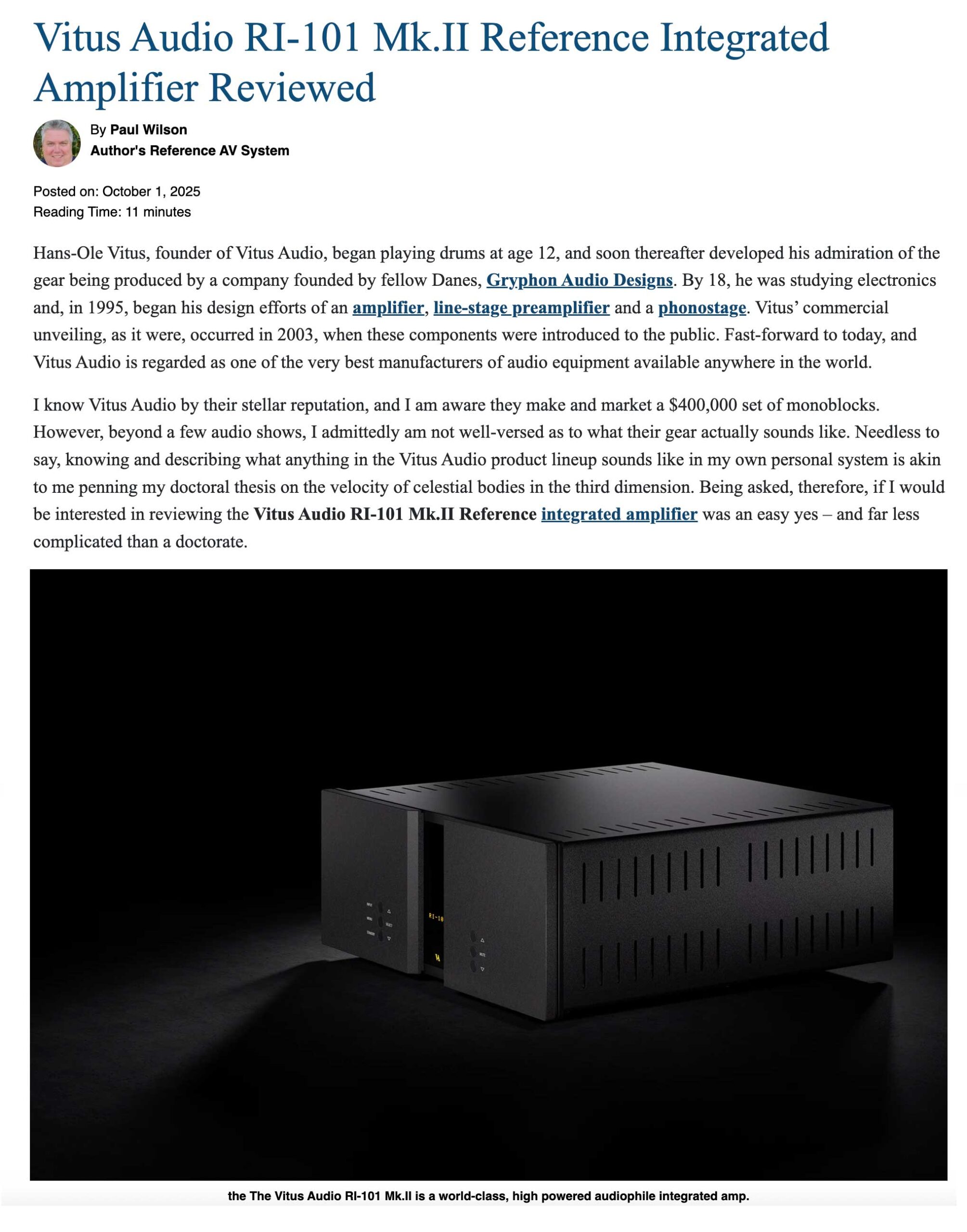 As Edgar Kramer, Editor-in-Chief at SoundStage Australia put it: “The Vitus Audio RI-101 is a stupendous sonic performer, excelling at the vividness and life of music… tight, punchy and detailed bass jumps from the mix while the RI-101 amplifier simply thinks, ‘Is this all you’ve got?’”